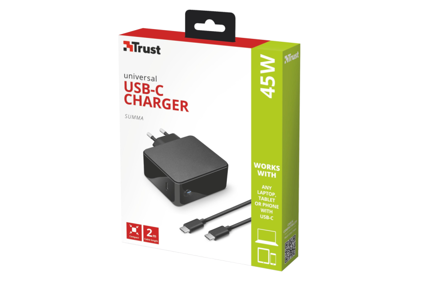 Компактное универсальное устройство мощностью 45 Вт с кабелем для зарядки ноутбука или любого другого устройства с портом USB-C.